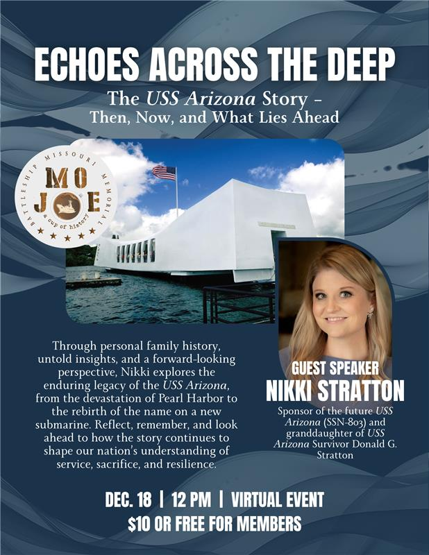 Join Nikki Stratton, Sponsor of the future USS Arizona (SSN-803) and granddaughter of USS Arizona Survivor Donald G. Stratton, for a powerful virtual presentation that bridges generations. Through personal family history, untold insights, and a forward-looking perspective, Nikki explores the enduring legacy of the USS Arizona, from the devastation of Pearl Harbor to the rebirth of the name on a new submarine. This meaningful conversation invites audiences to reflect, remember, and look ahead to how the story continues to shape our nation’s understanding of service, sacrifice, and resilience.